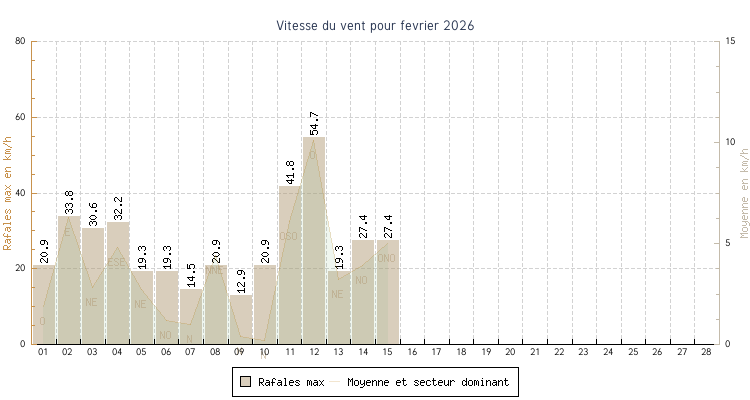 | min | max | moy | Vitesse (rafales) | Secteur | ||