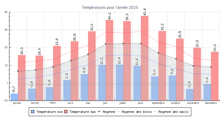 | aout | 11.6 °C | 17.8 °C | 42.6 °C | 33.1 °C | 25.4 °C | 2.1 km/h | 25.7 km/h | NNO |