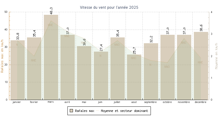 | fevrier | -2.6 °C | 4.4 °C | 18.0 °C | 14.7 °C | 9.1 °C | 2.0 km/h | 35.4 km/h | NNE |