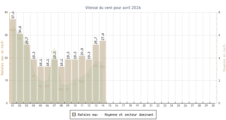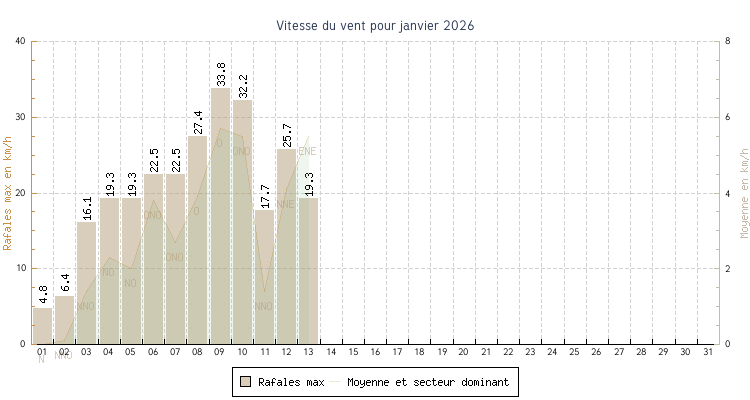 | min | max | moy | Vitesse (rafales) | Secteur | ||